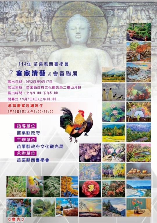苗栗縣西畫學會創立於民國71 年,由50 位熱愛 繪畫的在地人士組成,是縣內唯一專注西畫的藝術團 體。歷經多位理事長推動,學會持續耕耘發展,致力 以藝術啟迪人心、美化生活,並積極與其他藝術團體 交流,豐富在地藝文風貌。 本次聯展展出會員以人物、風景、靜物為主題的 多樣創作,體現藝術家們在客家庄生活中累積的情感 與靈感。誠摯邀請民眾參觀,一同感受藝術與客家文 化交織的魅力。